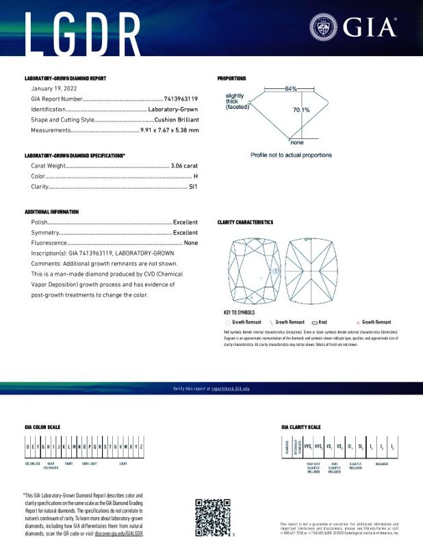 | 3.06 | Cushion Brilliant | H | SI1 | GIA | 70.1 | 64 | 9.91x7.67x5.38 | Contact Vendor |