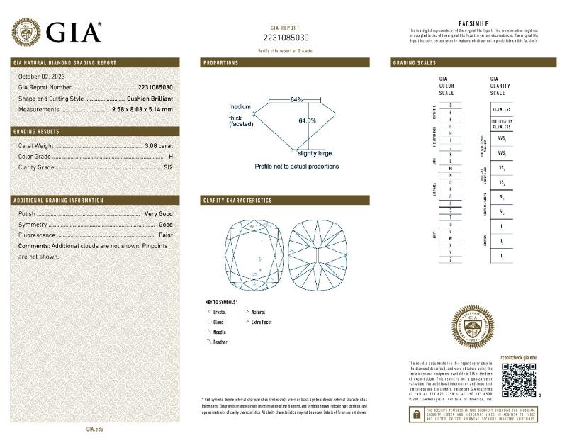 | 3.08 | Cushion Brilliant | H | SI2 | GIA | 64.0 | 64 | 9.58x8.03x5.14 | Contact Vendor |