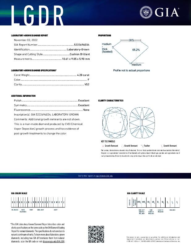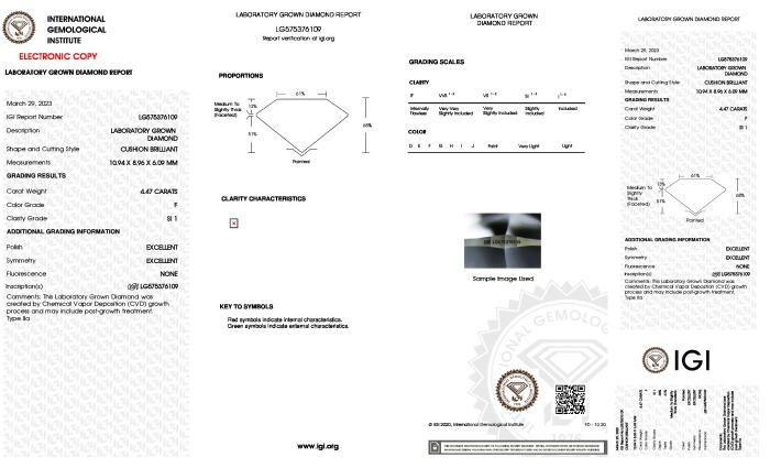 | 4.47 | Cushion Brilliant | F | SI1 | IGI | 68.0 | 61 | 10.94x8.96x6.09 | Contact Vendor |