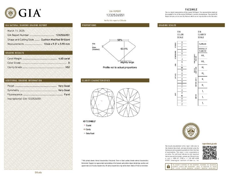| 4.60 | Cushion Brilliant | D | VS2 | GIA | 63.4 | 58 | 10.66x9.31x5.90 | Contact Vendor |