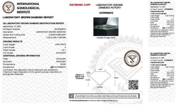 | 4.08 | Cushion Brilliant | E | VS1 | IGI | 68.6 | 61 | 11.00x8.45x5.80 | Contact Vendor |