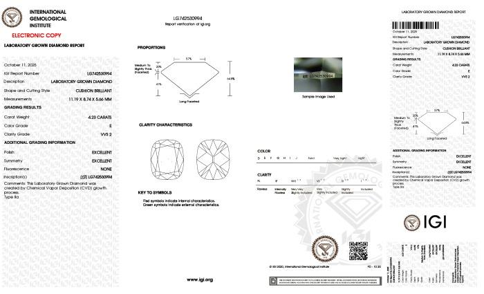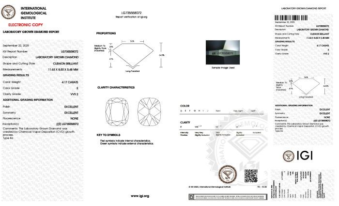 | 4.17 | Cushion Brilliant | E | VVS2 | IGI | 64.5 | 56 | 11.63x8.50x5.48 | Contact Vendor |