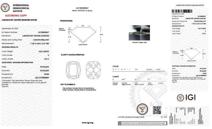 | 4.19 | Cushion Brilliant | E | VVS2 | IGI | 66.3 | 57 | 11.46x8.76x5.81 | Contact Vendor |