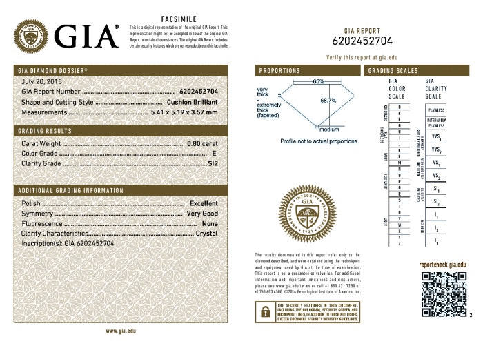 | 0.80 | Cushion Brilliant | H | SI2 | GIA | 68.9 | 65 | 5.53x5.14x3.54 | Contact Vendor |