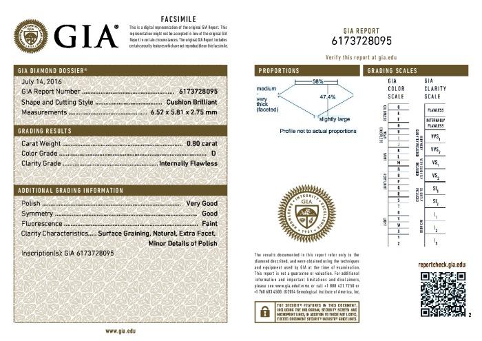 | 0.80 | Cushion Brilliant | D | IF | GIA | 47.4 | 58 | 6.52x5.81x2.75 | Contact Vendor |