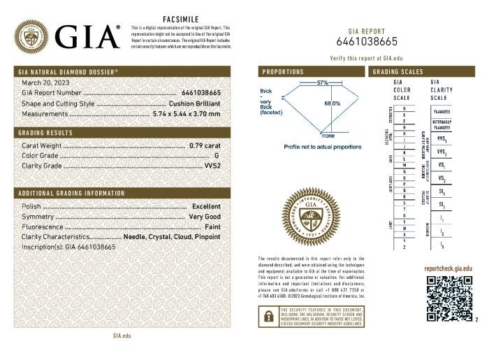 | 0.79 | Cushion Brilliant | G | VVS2 | GIA | 68.0 | 57 | 5.74x5.44x3.70 | Contact Vendor |