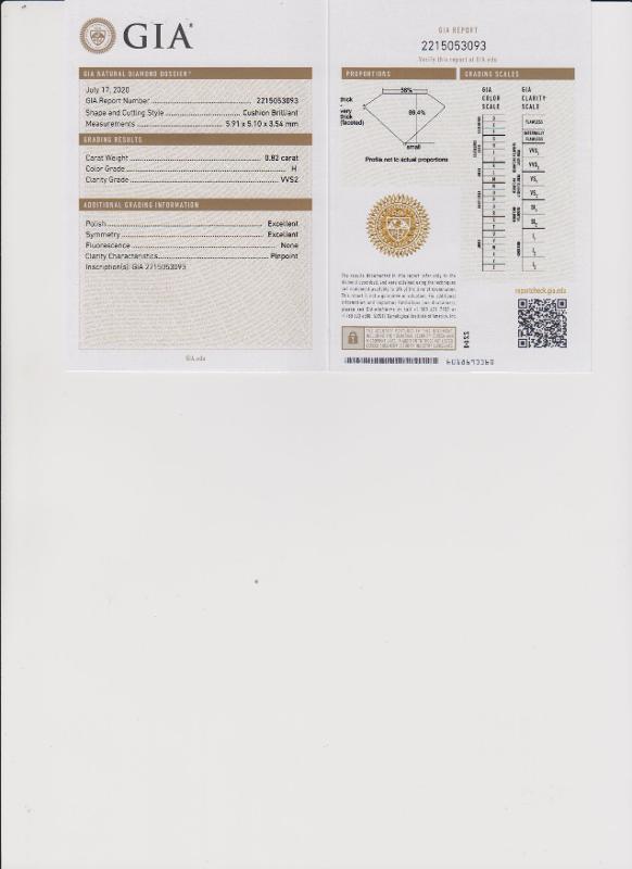 | 0.82 | Cushion Brilliant | H | VVS2 | GIA | 69.4 | 56 | 5.91x5.10x3.54 | Contact Vendor |