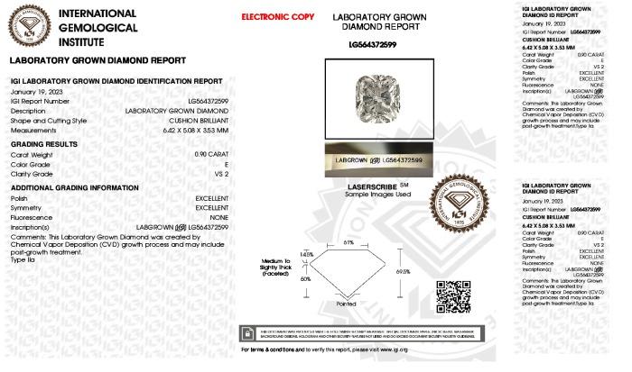 | 0.90 | Cushion Brilliant | E | VS2 | IGI | 69.5 | 61 | 6.42x5.08x3.53 | Contact Vendor |
