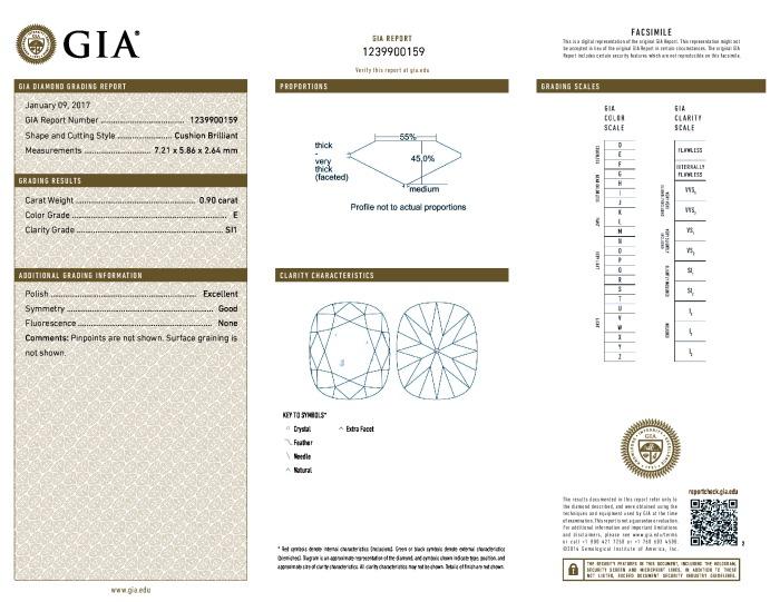 | 0.90 | Cushion Brilliant | E | SI1 | GIA | 45.0 | 55 | 7.21x5.86x2.64 | Contact Vendor |