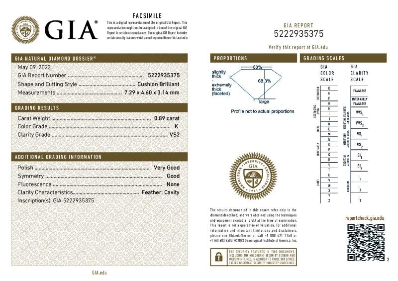 | 0.89 | Cushion Brilliant | K | VS2 | GIA | 68.3 | 60 | 7.29x4.60x3.14 | Contact Vendor |