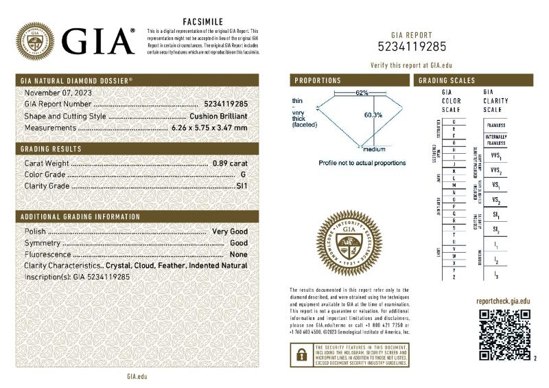 | 0.89 | Cushion Brilliant | G | SI1 | GIA | 60.3 | 62 | 6.26x5.75x3.47 | Contact Vendor |