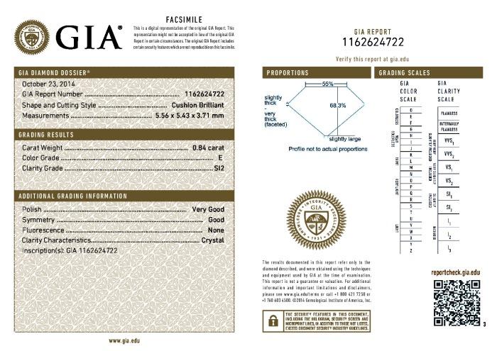| 0.84 | Cushion Brilliant | E | SI2 | GIA | 68.3 | 55 | 5.56x5.43x3.71 | Contact Vendor |