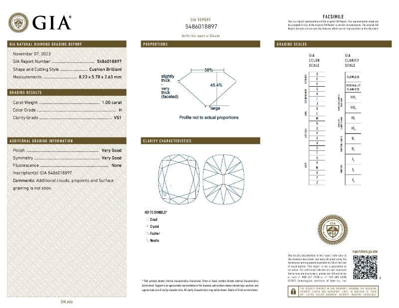 | 1.00 | Cushion Brilliant | H | VS1 | GIA | 45.4 | 58 | 8.23x5.78x2.63 | Contact Vendor |