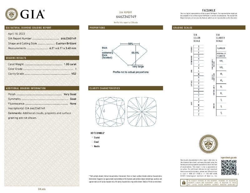 | 1.00 | Cushion Brilliant | I | VS2 | GIA | 55.6 | 56 | 6.21x6.11x3.40 | Contact Vendor |