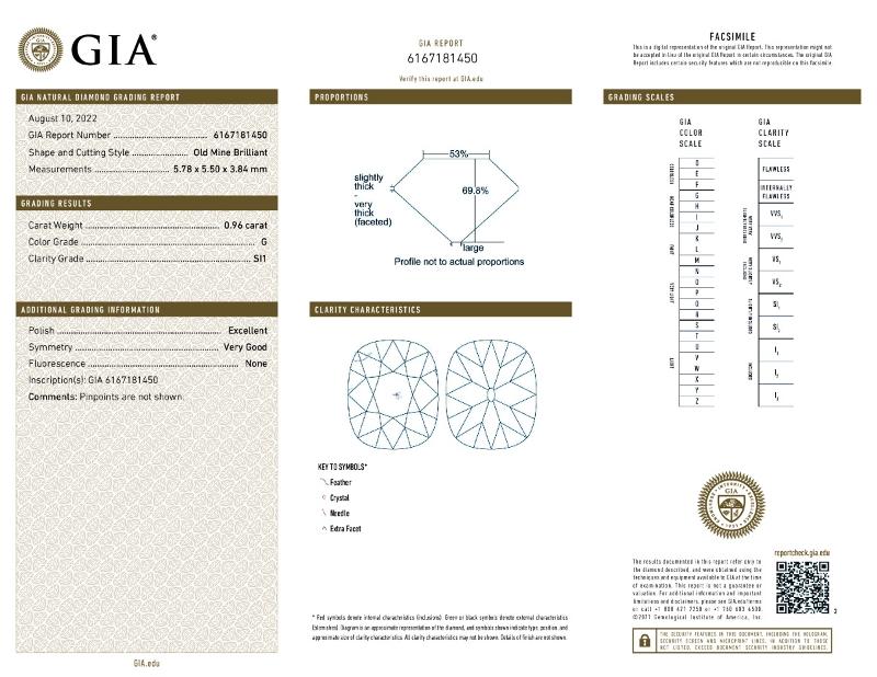 | 0.96 | Cushion Brilliant | G | SI1 | GIA | 69.8 | 53 | 5.78x5.50x3.84 | Contact Vendor |