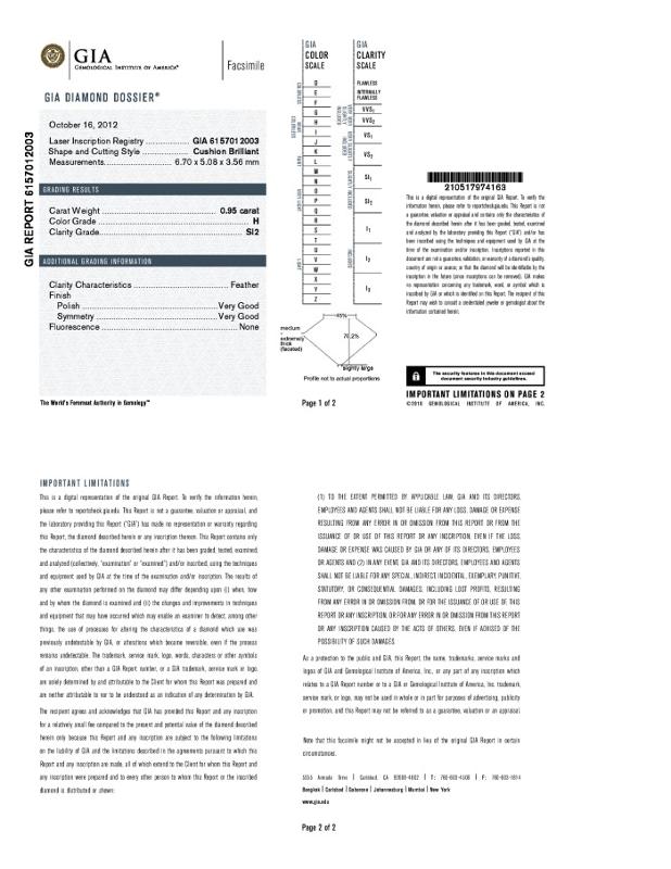 | 0.95 | Cushion Brilliant | H | SI2 | GIA | 70.2 | 45 | 6.70x5.08x3.56 | Contact Vendor |