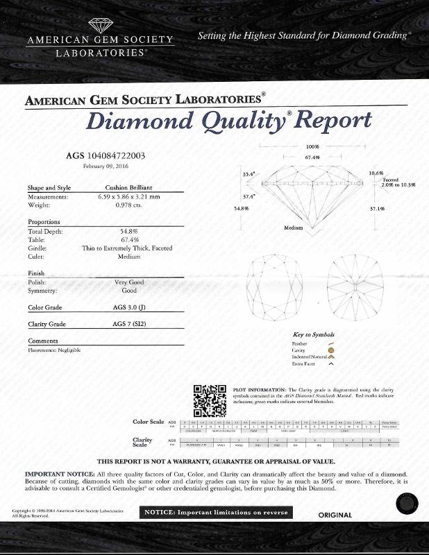 | 0.97 | Cushion Brilliant | J | SI2 | AGS | 54.8 | 67 | 6.59x5.86x3.21 | Contact Vendor |