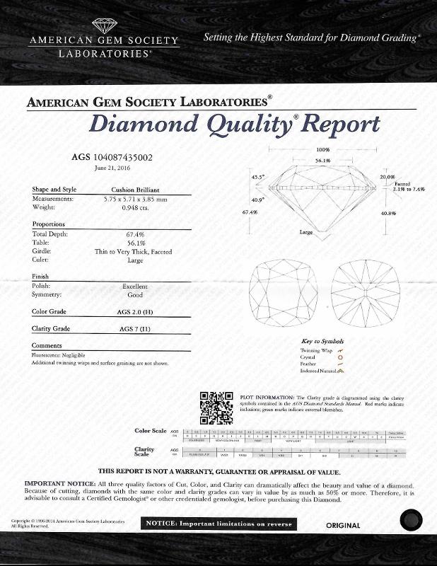 | 0.94 | Cushion Brilliant | H | I1 | AGS | 67.4 | 56 | 5.75x5.71x3.85 | Contact Vendor |