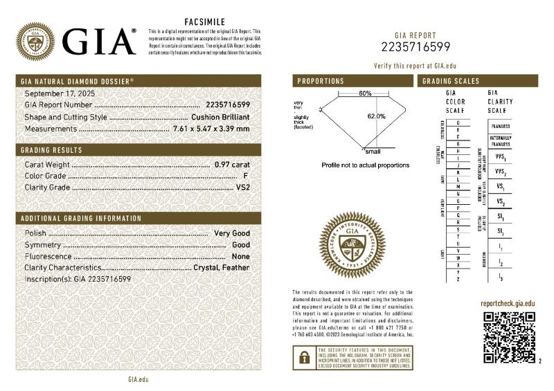| 0.97 | Cushion Brilliant | F | VS2 | GIA | 62.0 | 60 | 7.61x5.47x3.39 | Contact Vendor |