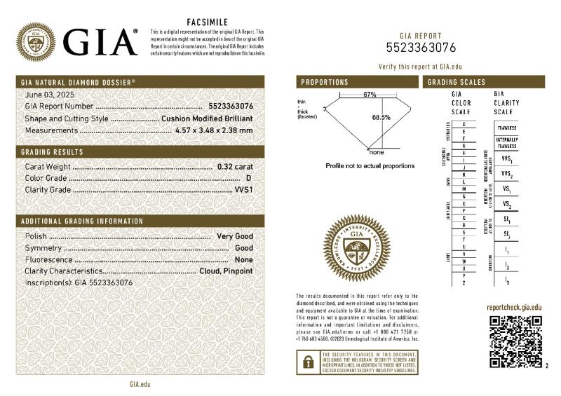 | 0.32 | Cushion Mod Brilliant | D | VVS1 | GIA | 68.5 | 67 | 4.57x3.48x2.38 | Contact Vendor |
