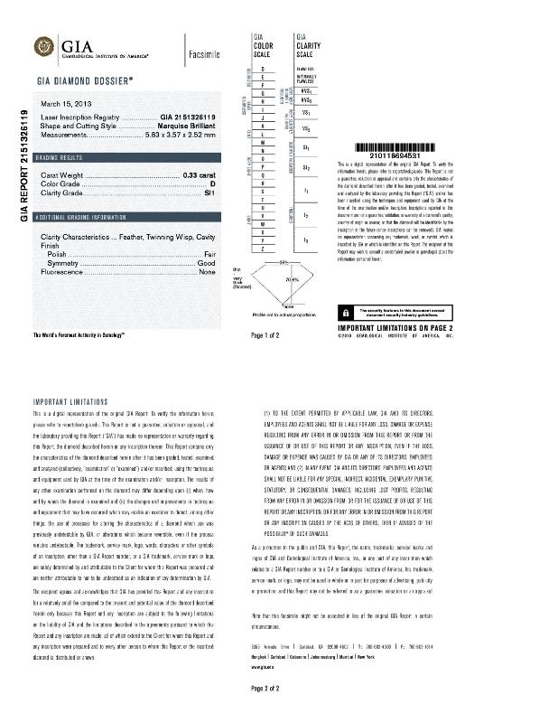 | 0.33 | Marquise | D | SI1 | GIA | 70.6 | 59 | 5.83x3.57x2.52 | Contact Vendor |