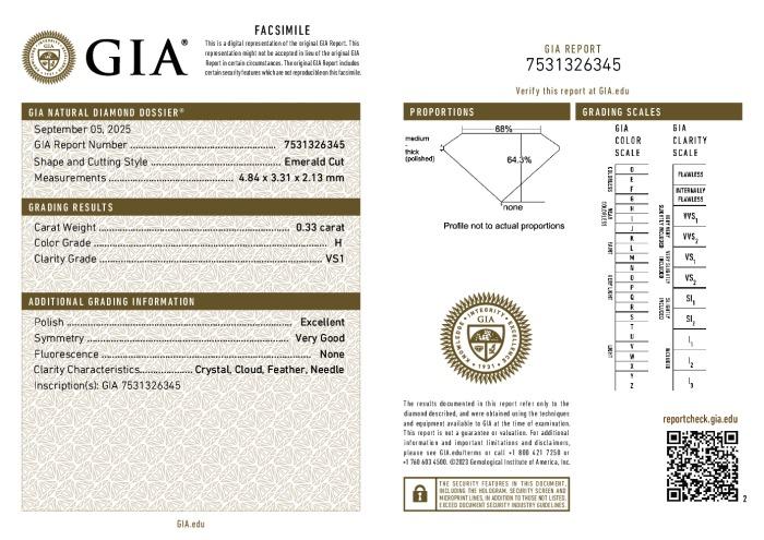 | 0.33 | Emerald | F | VS2 | GIA | 65.8 | 68 | 4.61x3.37x2.22 | Contact Vendor |