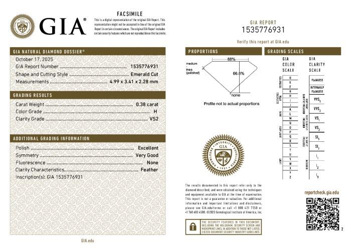 | 0.38 | Emerald | H | VS2 | GIA | 66.8 | 68 | 4.99x3.41x2.28 | Contact Vendor |