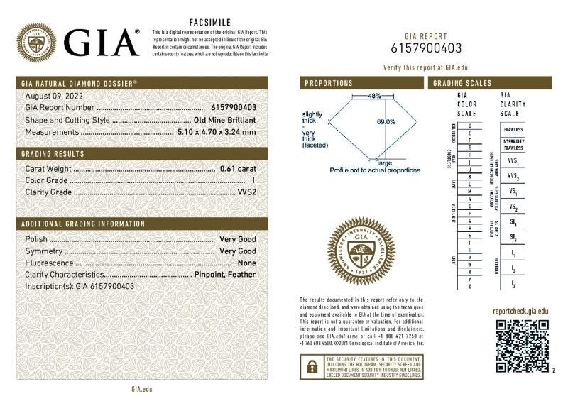 | 0.61 | Old Miner | I | VVS2 | GIA | 69.0 | 48 | 5.10x4.70x3.24 | Contact Vendor |