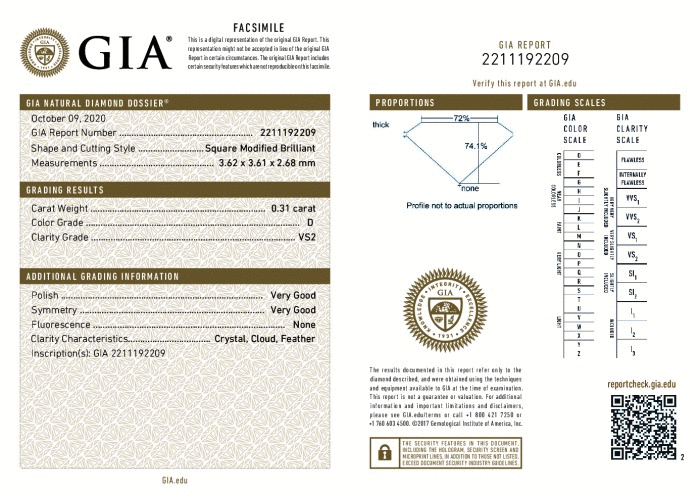 | 0.31 | Princess | D | VS2 | GIA | 74.1 | 72 | 3.62x3.61x2.68 | Contact Vendor |