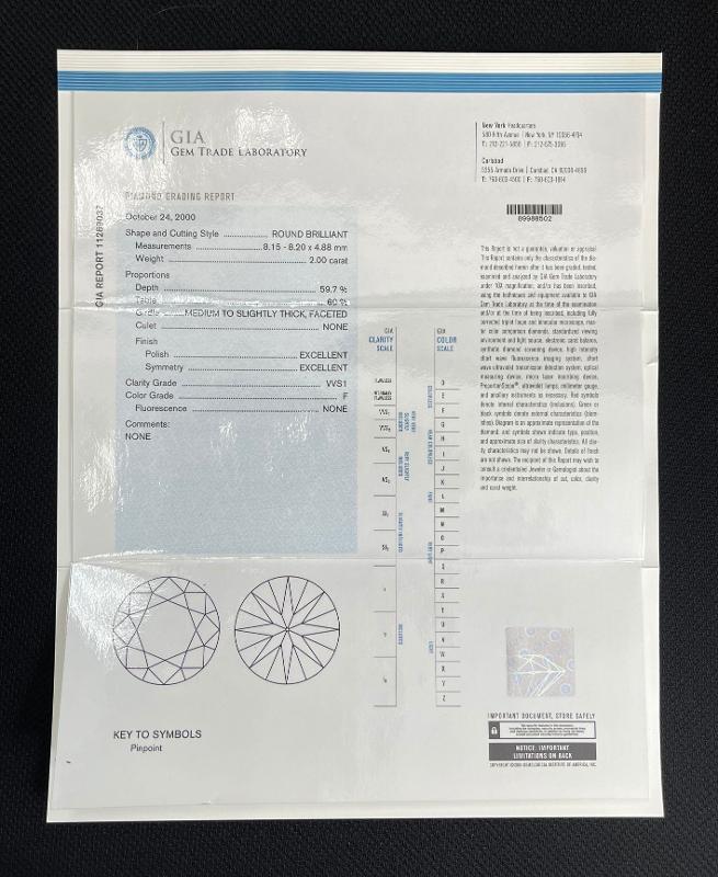 | 2.00 | Round | F | VVS2 | IGI-NY | 59.4 | 60 | 8.15x8.19x4.85 | Contact Vendor |