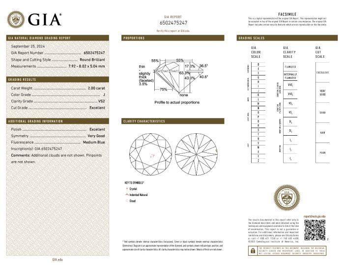 | 2.00 | Round | J | VS2 | GIA | 60.3 | 63 | 8.08x8.17x4.90 | Contact Vendor |