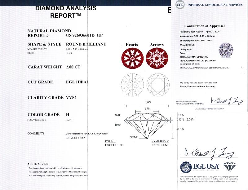 | 2.00 | Round | H | VVS2 | EGLUSA | 62.7 | 57 | 8.01x7.96x5.00 | Contact Vendor |