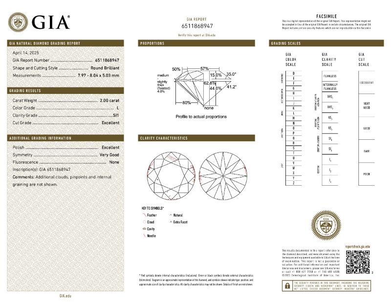 | 2.00 | Round | L | SI1 | GIA | 62.8 | 57 | 7.97x8.04x5.03 | Contact Vendor |
