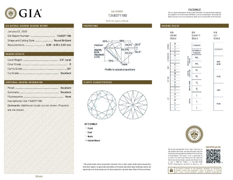 | 2.01 | Round | E | SI1 | GIA | 62.5 | 56 | 8.00x8.05x5.02 | Contact Vendor |