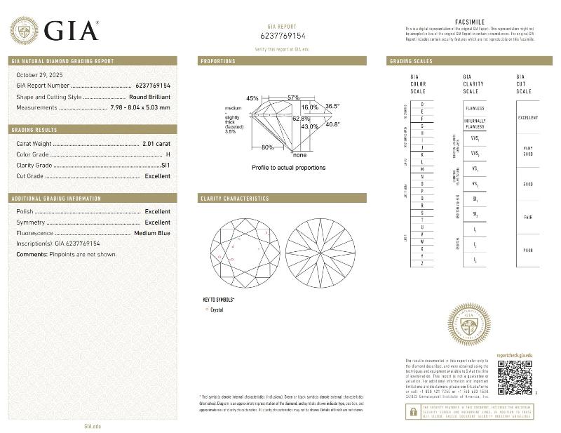 | 2.01 | Round | H | SI1 | GIA | 62.8 | 57 | 7.98x8.04x5.03 | Contact Vendor |
