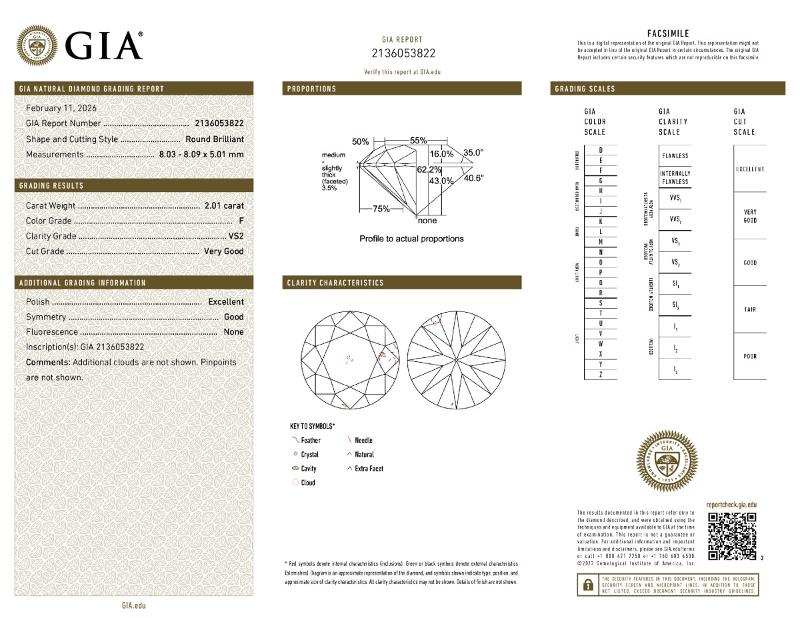 | 2.01 | Round | F | VVS2 | IGI | 62.2 | 57 | 8.07x8.06x5.02 | Contact Vendor |
