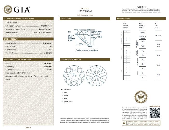 | 2.01 | Round | H | SI1 | GIA | 59.7 | 62 | 8.14x8.19x4.87 | Contact Vendor |