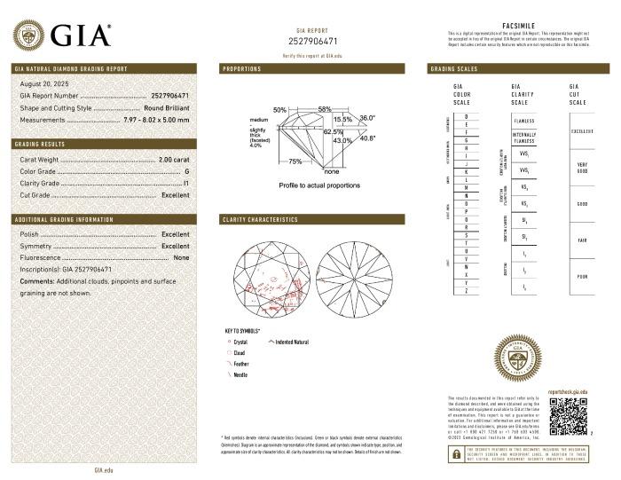 | 2.00 | Round | G | I1 | GIA | 62.5 | 58 | 7.97x8.02x5.00 | Contact Vendor |