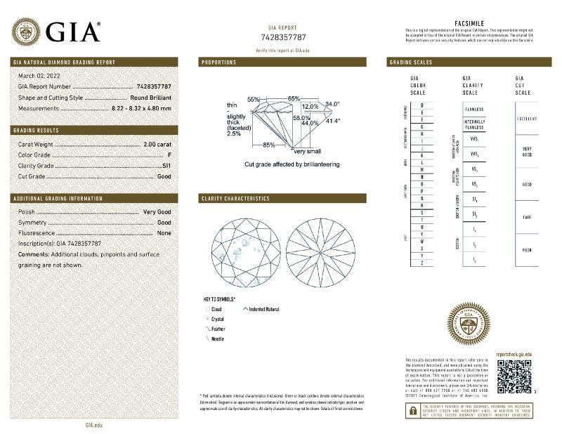 | 2.00 | Round | F | SI1 | GIA | 58.0 | 65 | 8.22x8.32x4.80 | Contact Vendor |