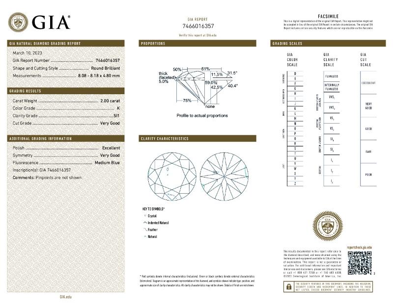 | 2.00 | Round | K | SI1 | GIA | 59.0 | 61 | 8.08x8.18x4.80 | Contact Vendor |