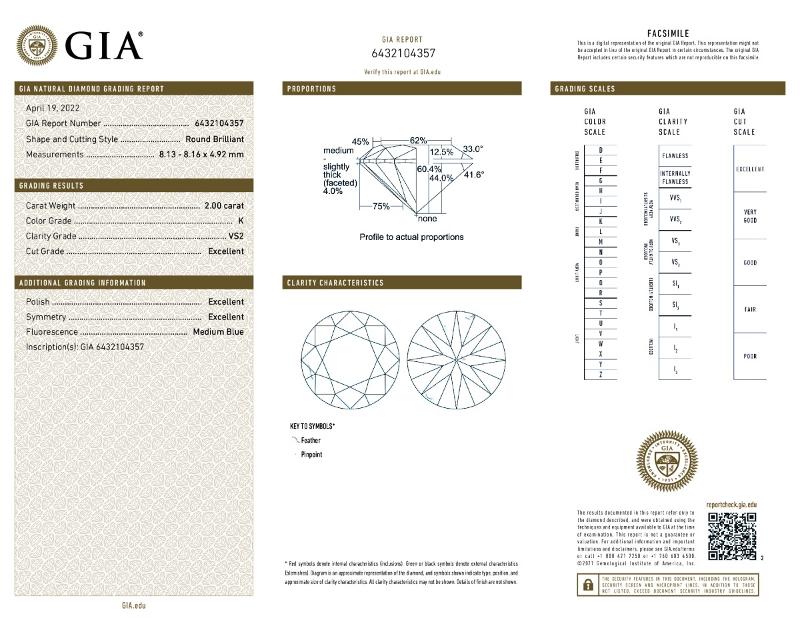 | 2.00 | Round | K | VS2 | GIA | 60.4 | 62 | 8.13x8.16x4.92 | Contact Vendor |
