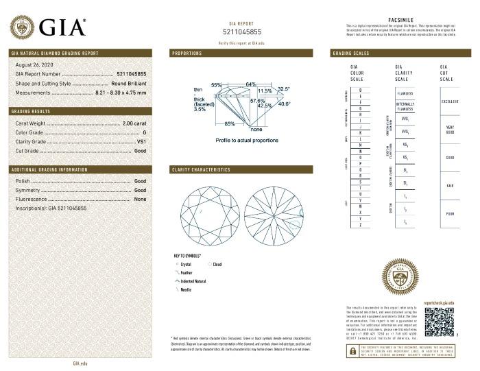 | 2.00 | Round | G | VS1 | GIA | 57.6 | 64 | 8.21x8.30x4.75 | Contact Vendor |