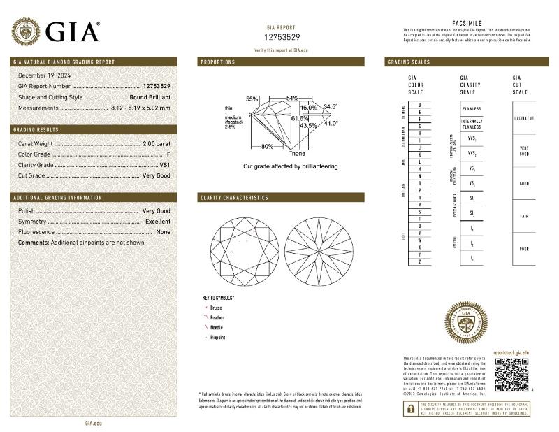| 2.00 | Round | F | VS1 | GIA | 61.6 | 54 | 8.12x8.19x5.02 | Contact Vendor |