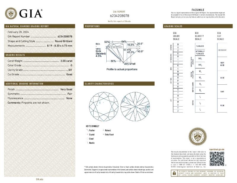 | 2.00 | Round | G | SI1 | GIA | 57.4 | 64 | 8.19x8.30x4.73 | Contact Vendor |