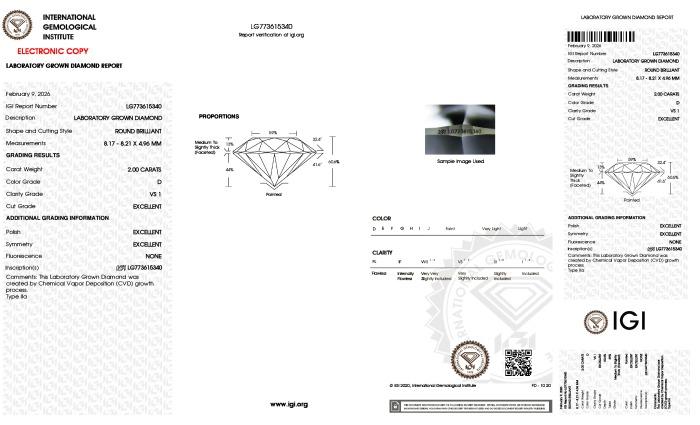 | 2.00 | Round | D | VS1 | IGI | 61.5 | 62 | 8.05x8.11x4.97 | Contact Vendor |