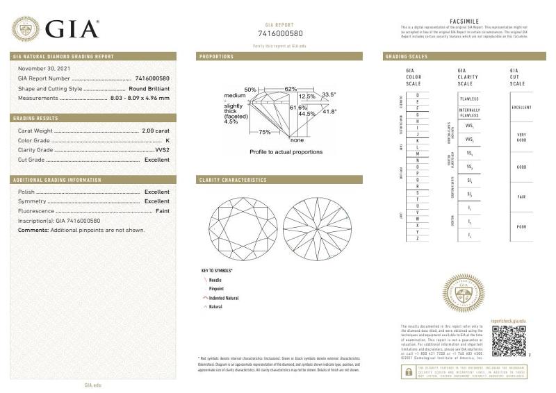 | 2.00 | Round | K | VVS2 | GIA | 61.6 | 62 | 8.09x8.03x4.96 | Contact Vendor |