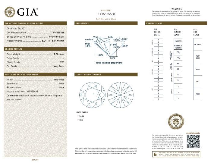 | 2.00 | Round | H | VS1 | GIA | 61.0 | 64 | 8.04x8.18x4.95 | Contact Vendor |