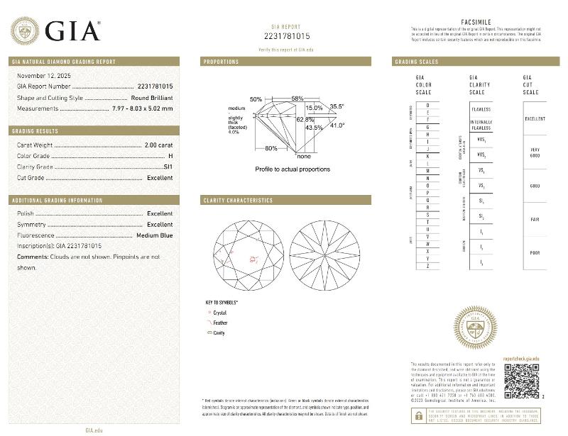 | 2.00 | Round | H | SI1 | GIA | 62.9 | 58 | 7.98x8.04x5.04 | Contact Vendor |